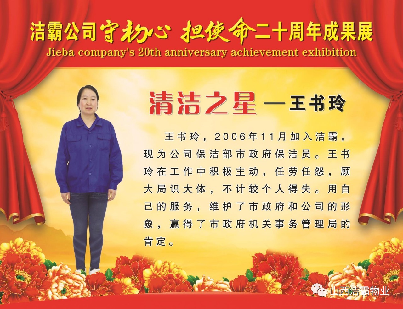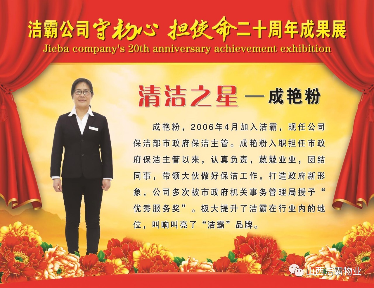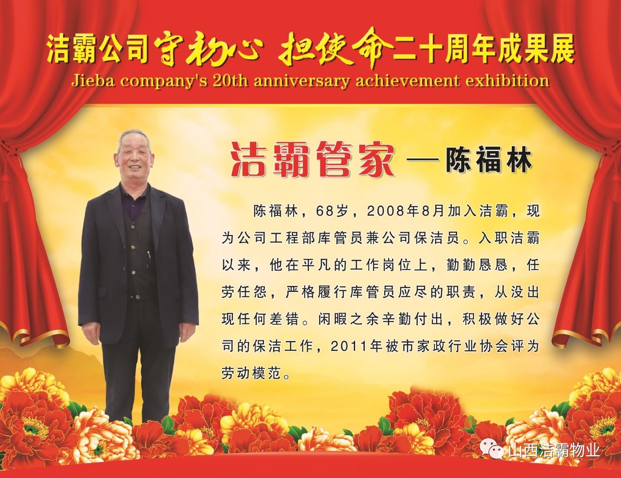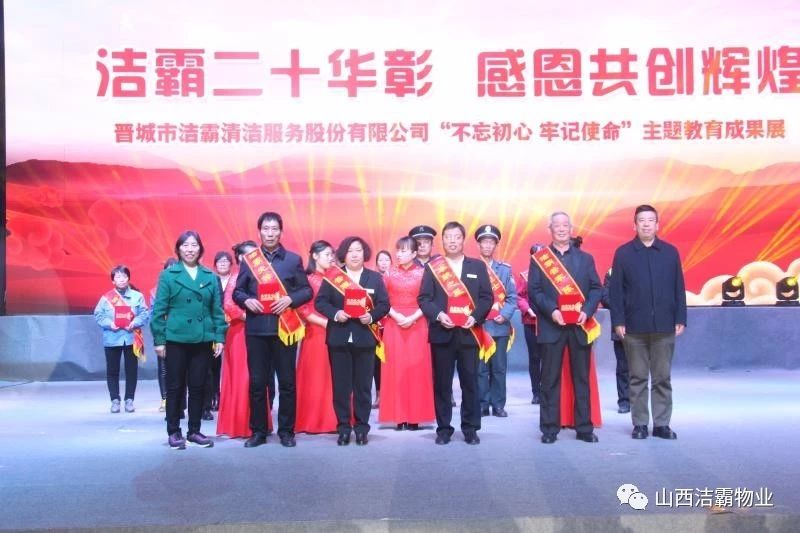 本次晚會以“潔霸二十華彰,感恩共創(chuàng)輝煌”為主題,此次慶典的核心思想是“感恩”,主要角色是潔霸的創(chuàng)業(yè)者。為此,公司對入職潔霸的創(chuàng)業(yè)功勛和一線員工進行了表彰獎勵。本次晚會共設8個獎項,包括“潔霸先鋒”“奉獻之星”“管理之星”“潔霸管家”“潔霸工匠”“清潔之星”“潔霸衛(wèi)士”“園藝之星”等。他們是:李山虎、張永智、史志霞、陳福林、王紅軍、余艷青、劉二丑、成艷粉、楊改梅、王書玲、張國榮、耿竹青、張粉霞、宋秋苗、陳先梅、張晉平、張偉山、趙瑞軍、王廣平、郭志云。晉城市原副市長成育廷、晉城市商務局原局長王新善、晉城市非公和社會組織工委書記郎軍芳、晉城市婦聯(lián)三級調(diào)研員李蓮菊、晉城市總工會商貿(mào)輕紡煙草服務業(yè)工會主席張玉濤、晉城市城區(qū)財政局局長翟明太等領導為他們頒獎。