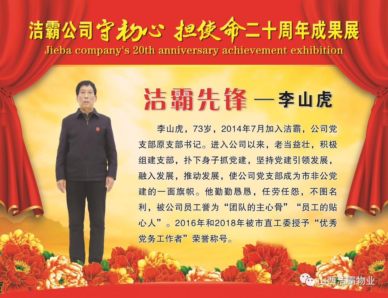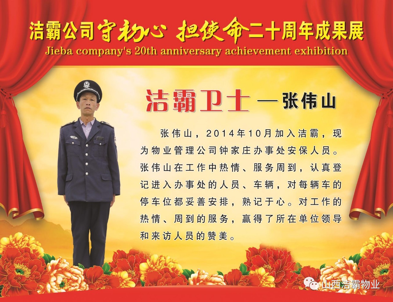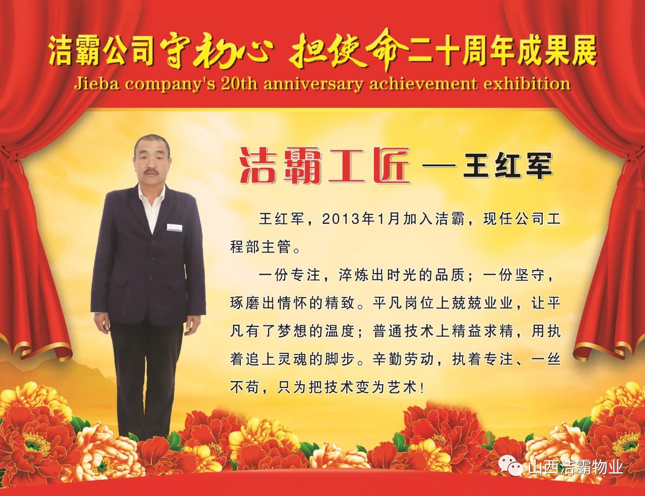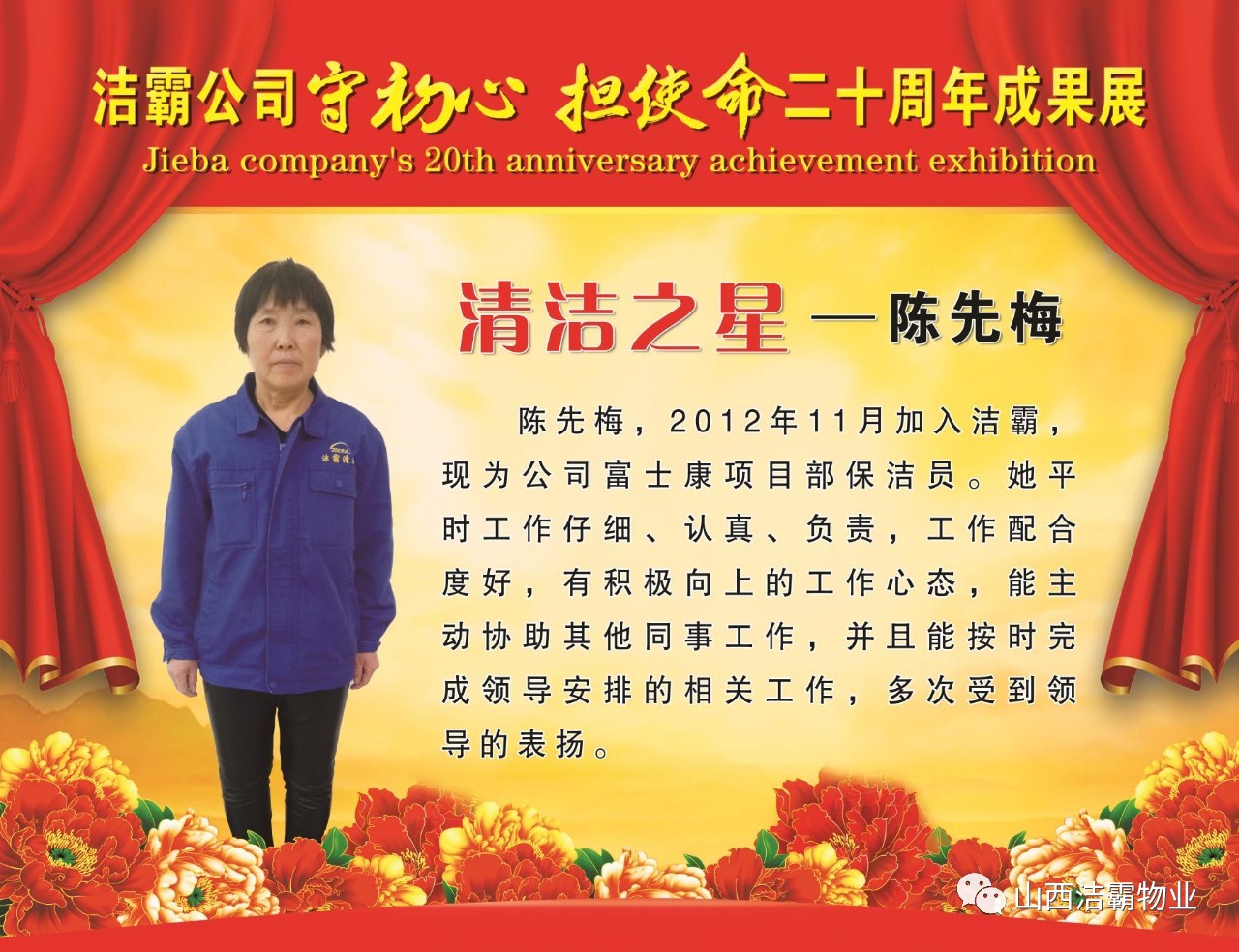 本次晚會以“潔霸二十華彰,感恩共創(chuàng)輝煌”為主題,此次慶典的核心思想是“感恩”,主要角色是潔霸的創(chuàng)業(yè)者。為此,公司對入職潔霸的創(chuàng)業(yè)功勛和一線員工進行了表彰獎勵。本次晚會共設8個獎項,包括“潔霸先鋒”“奉獻之星”“管理之星”“潔霸管家”“潔霸工匠”“清潔之星”“潔霸衛(wèi)士”“園藝之星”等。他們是:李山虎、張永智、史志霞、陳福林、王紅軍、余艷青、劉二丑、成艷粉、楊改梅、王書玲、張國榮、耿竹青、張粉霞、宋秋苗、陳先梅、張晉平、張偉山、趙瑞軍、王廣平、郭志云。晉城市原副市長成育廷、晉城市商務局原局長王新善、晉城市非公和社會組織工委書記郎軍芳、晉城市婦聯(lián)三級調(diào)研員李蓮菊、晉城市總工會商貿(mào)輕紡煙草服務業(yè)工會主席張玉濤、晉城市城區(qū)財政局局長翟明太等領導為他們頒獎。