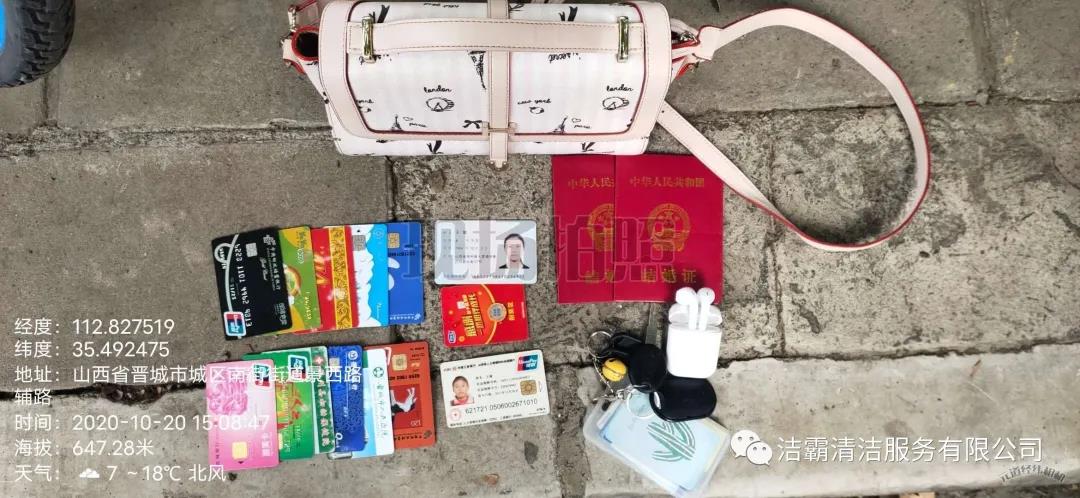 10月20日下午3點(diǎn)左右,晉城市潔霸清潔服務(wù)股份有限公司保潔部環(huán)衛(wèi)經(jīng)理李通和工人在城區(qū)南街街道景西路段進(jìn)行街道清洗作業(yè)時,忽然看見晉城農(nóng)商銀行門前的綠化帶里有一個女士挎包,忙叫環(huán)衛(wèi)工人郭志云把挎包撿了起來。當(dāng)時就考慮到失主丟失挎包以后一定很著急,在同事的共同見證下他們打開挎包,經(jīng)過查看,發(fā)現(xiàn)挎包內(nèi)有一張王女士的身份證、社保卡及銀行卡數(shù)張,還有結(jié)婚證、鑰匙、耳機(jī)、富士康工牌等物品。憑借富士康工牌上的工號,他們給富士康打電話聯(lián)系到了失主,后由環(huán)衛(wèi)主管秦彩鳳將挎包交到失主手中。收到失而復(fù)得的挎包,王女士又驚又喜,感激萬分。