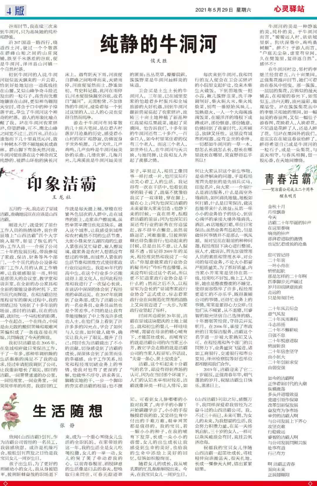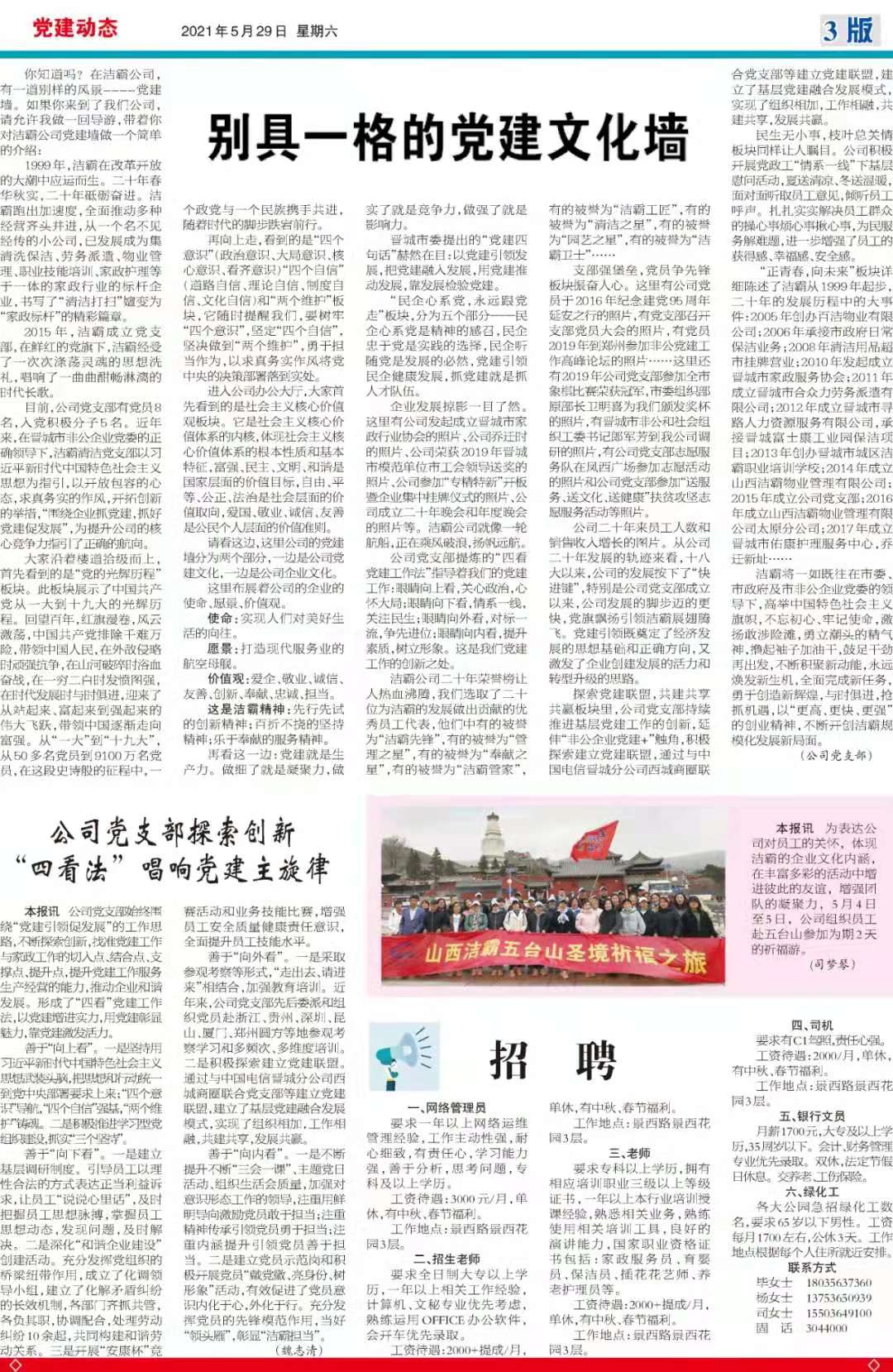 今天是2021529日,經(jīng)過一個多月的緊張籌辦,《山西潔霸》報紙終于創(chuàng)刊啦!這是潔霸人的一件大喜事,也是潔霸人的驕傲!伴隨著《山西潔霸》紙質(zhì)版的內(nèi)部發(fā)行,電子版也同步與你見面了。希望你能通過這個宣傳窗口,更好地走近潔霸,了解潔霸,關(guān)注潔霸,支持潔霸。
