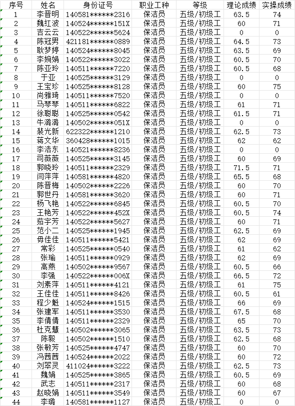 2024721日第23批保潔員初級認定人員成績公示