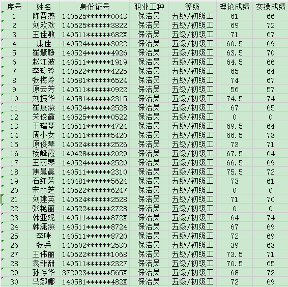晉城市潔霸清潔服務(wù)股份有限公司職業(yè)技能等級認(rèn)定中心2024年8月18日第30批保潔員初級認(rèn)定人員成績公示