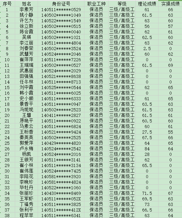 晉城市潔霸清潔服務(wù)股份有限公司職業(yè)技能等級認(rèn)定中心現(xiàn)將2024年9月1日認(rèn)定人員成績公示如下: