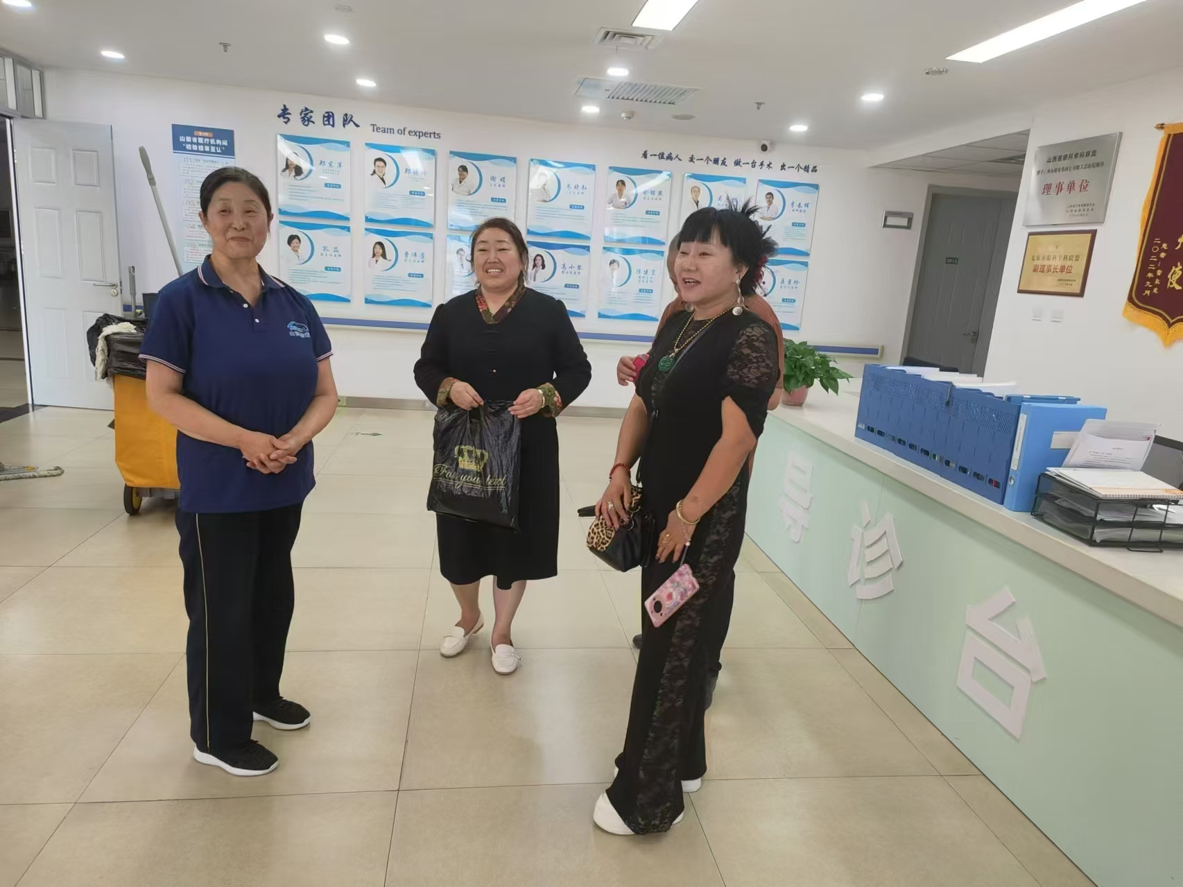高美玉提著撿到的手提袋正準(zhǔn)備上交管理人員,看見迎面走來了眼科主任,正在詢問大家有沒有撿到一個黑色的手提袋,高美玉于是在第一時間把手提袋交給了眼科主任。