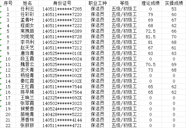 晉城市潔霸清潔服務(wù)股份有限公司職業(yè)技能等級(jí)認(rèn)定中心2024年9月15日第38批保潔員初級(jí)認(rèn)定人員成績公示