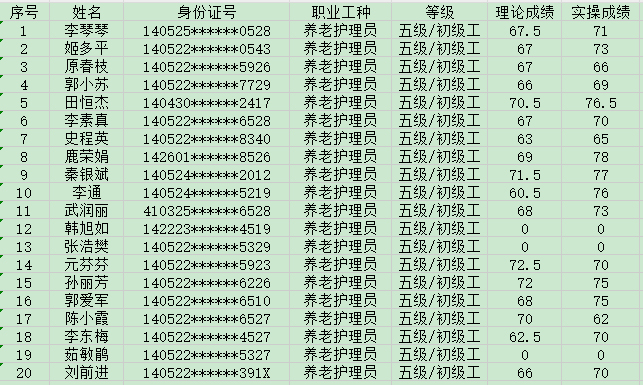 20241014日第42批養(yǎng)老護(hù)理員初級認(rèn)定人員成績公示