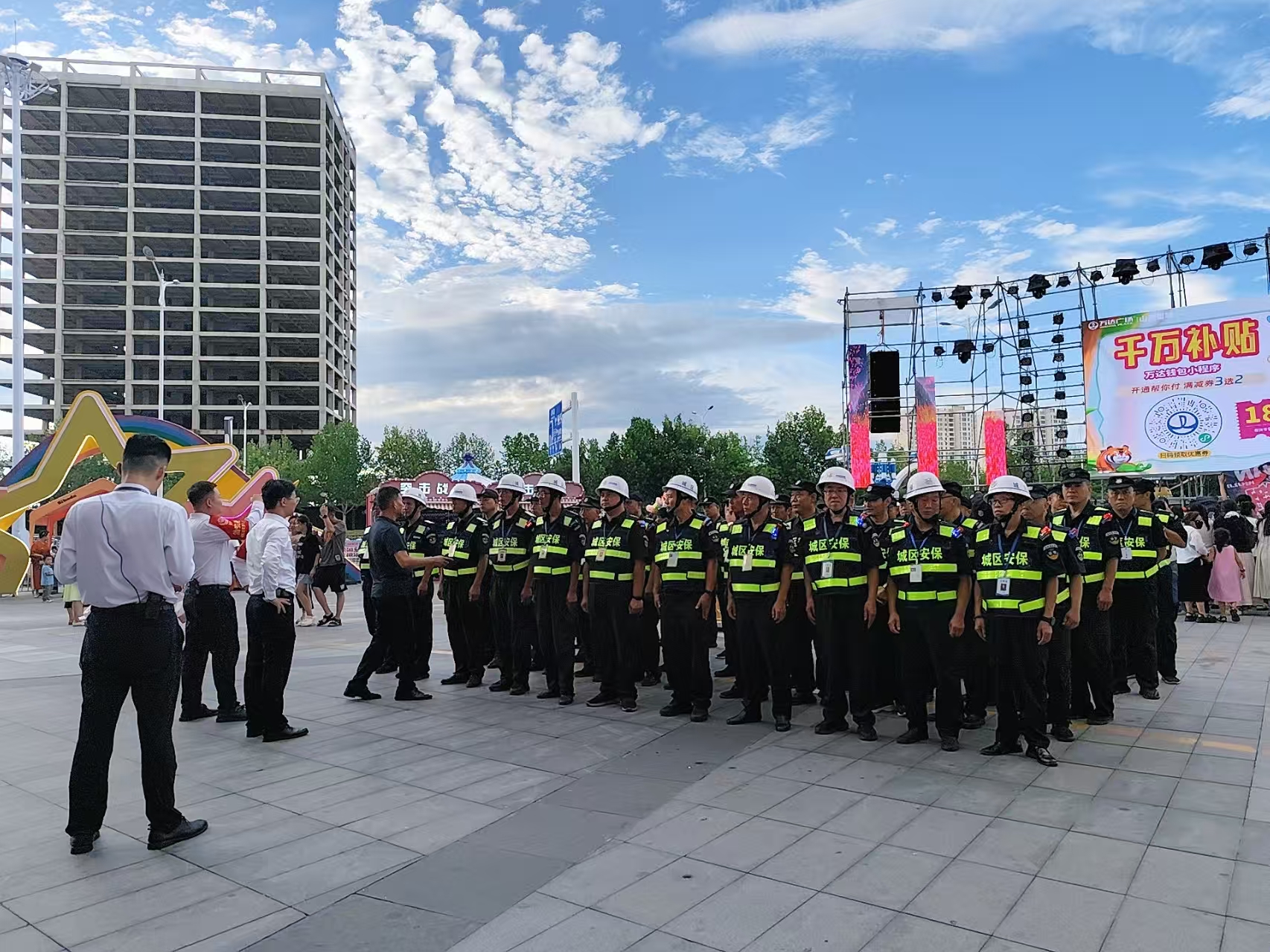 活動(dòng)前夕,城區(qū)保安公司提前謀劃并多次與萬(wàn)達(dá)商場(chǎng)負(fù)責(zé)人對(duì)接,對(duì)活動(dòng)現(xiàn)場(chǎng)及周邊進(jìn)行多次實(shí)地詳細(xì)勘察,綜合分析研判活動(dòng)規(guī)模、表演區(qū)域及人流車(chē)流等要素情況,制定了周密的安保方案,抽調(diào)50名經(jīng)驗(yàn)豐富、訓(xùn)練有素的保安人員組成專(zhuān)項(xiàng)執(zhí)勤隊(duì)伍,采取定點(diǎn)執(zhí)勤、流動(dòng)巡查的方式,合理布控保安力量,明確各崗位職責(zé)與應(yīng)急處置流程,分崗定責(zé),壓實(shí)責(zé)任,確;顒(dòng)全程的安全性和可控性。組織全體執(zhí)勤人員進(jìn)行崗前培訓(xùn),重點(diǎn)強(qiáng)調(diào)人流疏導(dǎo)技巧、突發(fā)事件應(yīng)對(duì)方法以及服務(wù)禮儀規(guī)范,確保每個(gè)人都熟悉崗位要求,以最佳狀態(tài)投入執(zhí)勤工作。