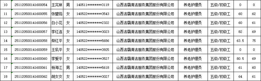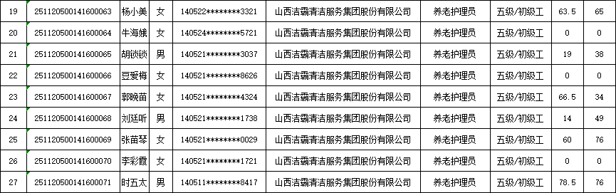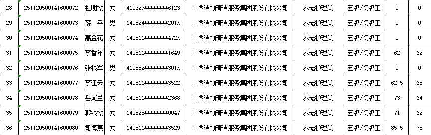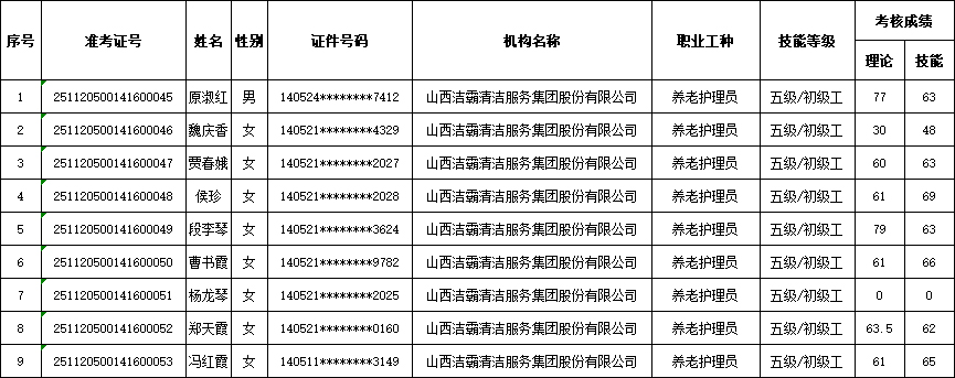 山西潔霸清潔服務集團股份有限公司職業(yè)技能等級認定中心2025年11月23日第5批養(yǎng)老護理員初級認定人員成績公示